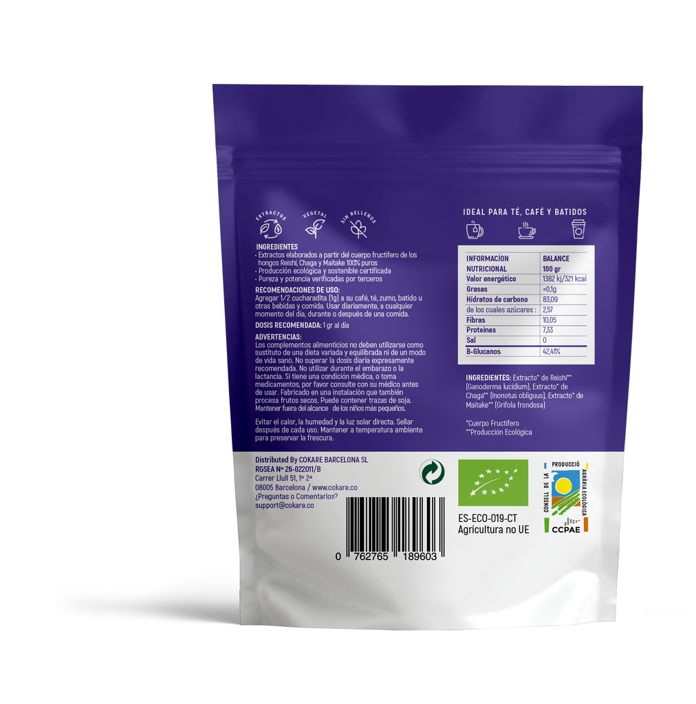 - 1000 mg de cuerpo fructífero orgánico de reishi, chaga y maitake shiitake por porción